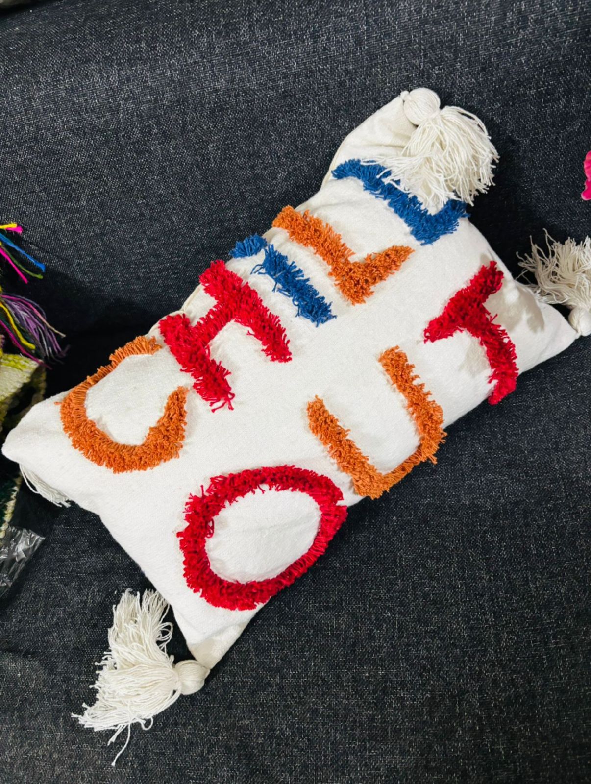 Add a cozy vibe to your space with the “Chill Out” lumbar cover. Its furry texture and playful text make lounging extra comfy and stylish.