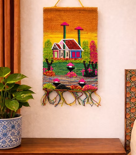 Add warmth and character to your space with this handmade jute wall hanging, crafted using traditional handweaving techniques. Each piece is a celebration of artisanal skill, featuring textured detailing and vibrant handcrafted motifs that bring life to any wall. Made from natural jute, it blends earthy charm with artistic expression, making it a timeless décor accent for modern and traditional interiors alike.